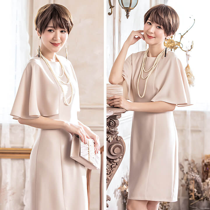 パーティードレス 4way 着回し 結婚式 二次会 ワンピース ミニドレス フォーマル ドレス ケープ付ドレス ケープドレス 2次会 スレンダーライン ベージュ ブラック 黒 ネイビー 紺 ピンク ママドレス 20代 30代 40代 同窓会 成人式 卒業式 入学式 卒園式 入園式 マント