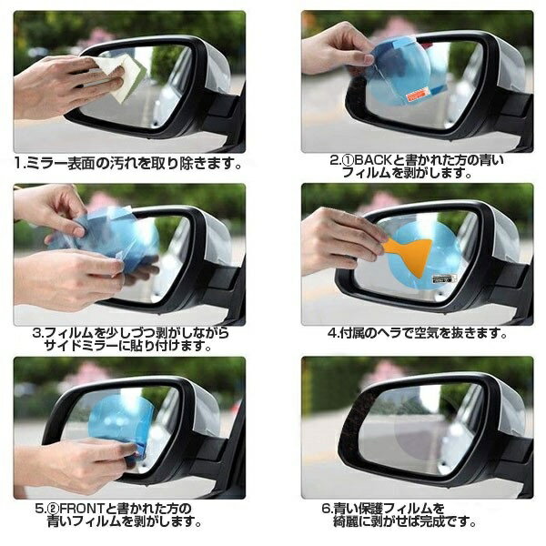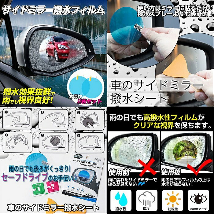 雨の日でもクリアな視界を保つ ◆サイドミラー撥水フィルム◆ 撥水効果抜群・高光透過率 商 品 説 明 ●雨のドライブで一番嫌なのが、サイドミラーの水滴・・・ 後ろの視界が悪くなってヒヤッとしたことありませんか? ●そんなドライバーにお勧めしたいのが、この貼るだけ簡単サイドミラー撥水フィルムの登場です♪